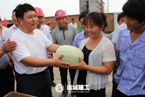 观摩活动结束后,公司领导对项目部全体员工进行了慰问,为奋战在施工一线的广大员工送去三白瓜、绿豆、白糖、藿香正气水、毛巾等夏季清凉消暑用品。