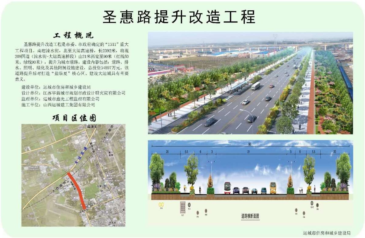 圣惠路提升改造工程是市委市政府确定的城建重点项目,南起涑水街,北至大运高速桥,长2392米,包括道路、排水、照明、绿化及其他附属设施建设,总投资43897万元。